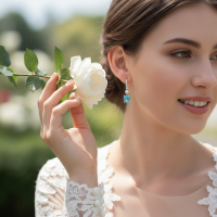 Aspire to the allure of tropical islands and azure skies with the mesmerising richness of these earrings. Breathtaking pear cut peridot crystals flow down to the sublime decadence of two evocative rhomboid cut aquamarine crystals, all brought to cohesion by the sophisticated elegance of pavé set crystal framing. A heart stopping combination, perfect for a destination wedding.