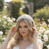 The exquisite delicacy of this luminous coronet evokes the legendary beauties of the Golden Age of Hollywood, capturing timeless glamour in its most refined form. Designed with perfect symmetry, this breathtaking masterpiece allows the exceptional crystal artistry to take center stage. From a bed of intensely set brilliant-cut cubic zirconia crystals, delicate pavé-set crescents rise gracefully, leading the eye to a striking apex of slender pear-cut stones. The flawless stonework radiates brilliance, catching and reflecting the light from every angle to ensure you truly bewitch and bedazzle on your magical day. Crafted with high-quality cubic zirconia crystals and plated in luxurious 18K white gold, this radiant piece offers both opulence and elegance. Measuring approximately 14 cm wide and 3 cm at its highest point, it creates a refined yet captivating silhouette worthy of a modern-day icon