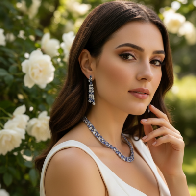Elevate your elegance with this exquisite statement necklace and earring set, featuring a stunning arrangement of sapphire and clear cut cubic zirconia crystals set against a lustrous silver finish. Plated in luxurious 18k white gold, necklace size is 43cm in length and earrings measure 6.6cm in length, making them the perfect accessory to enhance any outfit. Ideal for special occasions or to add a touch of glamour to your everyday look, this stunning set is a must-have addition to your jewellery collection.