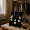 Embrace the charm of yesteryear with these exquisite Vintage Shimmer necklace set complete with matching earrings . The simulated ivory pearls and clear cubic zirconia crystals evoke a sense of timeless elegance, while the white gold plating adds a modern, lustrous touch. Whether you're dressing up for a special occasion or simply want to add a touch of vintage-inspired sophistication to your everyday look, this necklace set will become your new signature accessory. Details:-• Elegant design features simulated ivory pearls and clear cubic zirconia crystals • Plated in radiant 18K white gold for a high-end, luxurious finish • Earrings measure 2.5cm long with 1cm pearls for a sophisticated, statement look • Elevate any outfit from casual to couture with these versatile, eye-catching earrings