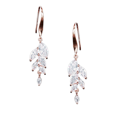 Like gilded wisteria blooms, these glistening points of light will bring cool fire and radiance to your day. Exquisitely clear Marquise cut crystal leaves form a cascade of radiance diminishing in size and culminating with an exquisite crystal leaf. A captivating way to bring dazzling luminosity to your special day. Details; High quality Cubic Zirconia crystals. High shine rose gold finish. Dimensions; earrings 3cm drop.
