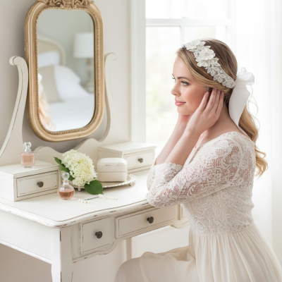 Exquisite embellished ribbon headband embellished with clear crystals and simulated ivory pearls in a beautiful floral design. Ribbon can be cut to size. Perfect for brides and bridesmaids