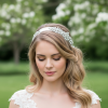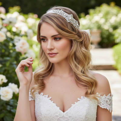 A vision of delicate romance, this embellished headband is gracefully set upon a soft ivory satin ribbon, flowing like silk from a storybook dream. Clear glass crystals shimmer along a radiant silver finish, catching the light like scattered stardust and adding a touch of celestial sparkle. Designed with beautiful versatility, this enchanting piece can be worn as a headpiece to crown your hairstyle with elegance, or styled as a bridal belt to softly define the waist with luminous charm. Timeless, graceful, and wonderfully adaptable — a fairytale accessory made to transform your most treasured moments.