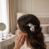 Captivate hearts and inspire minds with the enchantment of this sublime posy. Enigmatic fabric roses are framed by crystal pavé set flowers, shimmering pearls and radiant brilliant cut crystals. An alluring rose gold finish enhances the romance of this exquisite fancy. An intoxicating piece to conjure spellbinding beauty on your magical day. Details; Handmade fabric roses. high quality crystals. Simulated ivory pearls. High shine rose gold finish. Dimensions; 9cm x 5.5cm