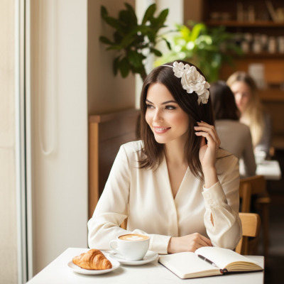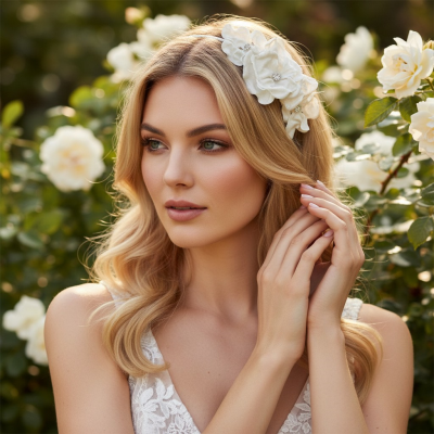 Chic and stylish headband - embellished with a floral sidepiece on an ivory covered headband.