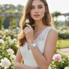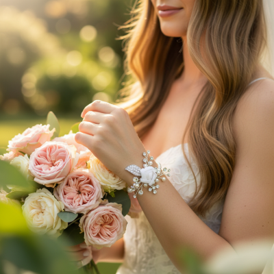 Adorn yourself with the lavish radiance of this piece; a demure fabric rose takes centre stage amidst a backdrop of brilliant cut Swarovski crystal drops and shimmering pearls, its perfection highlighted by a Swarovski crystal pavé set leaf. Capture this motif, evocative of romance and the glory of everlasting love, for your magic day.