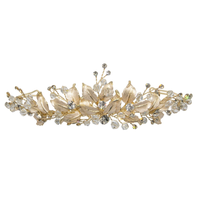 Bring enchantment to your day with this alluring flourish. A bed of delicate clear crystals and shimmering beads are cocooned by a cloud of 14k gld hand painted leaves. An intricate finish to bring harmony and sweetness to your look. Details; High quality crystals. Hand painted gold leaves.