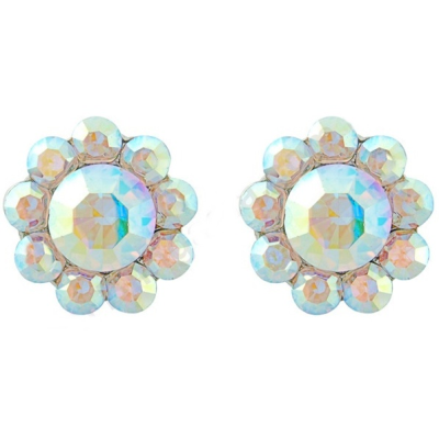 Shimmering crystal flower style stud earring in a chic design with AB crystals on a silver tone finish.